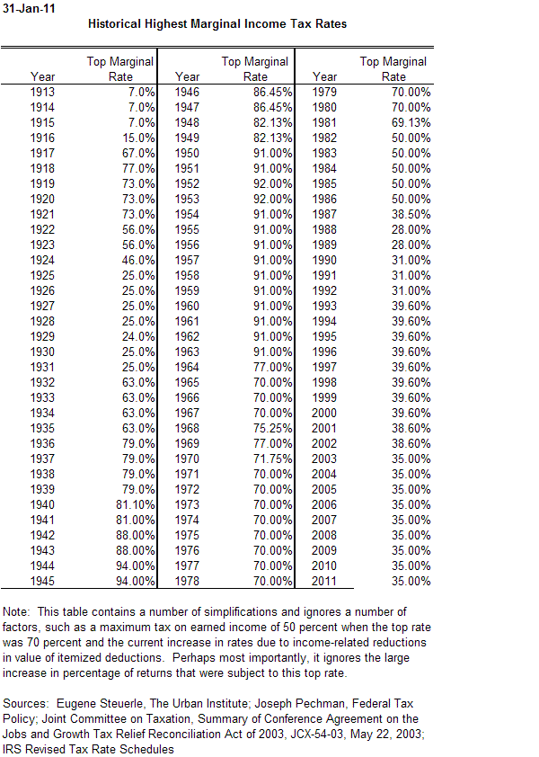 Of course, the Republican Party is horrified at the thought of letting the Bush tax cuts of 2001 and 2003 expire (as they were scheduled to in 2010) and allowing the top marginal rate to move from the current 35% to its previous 2000 level of 39.6%.  Even with massive federal deficits, the thought of a 4.6% hike on the marginal rate of millionaires and billionaires is totally unacceptable to the GOP tax-cut idealogues.