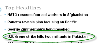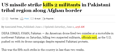 There is, as usual, no indication that these media outlets have any idea whatsoever about who was killed in these strikes. All they know is that “officials” (whether American or Pakistani) told them that they were “militants,” so they blindly repeat that as fact. They “report” this not only without having the slightest idea whether it’s true, but worse, with the full knowledge that the word “militant” is being aggressively distorted by deceitful U.S. government propaganda that defines the term to mean: any “military-age males” whom we kill (the use of the phrase “suspected militants” in the body of the article suffers the same infirmity).