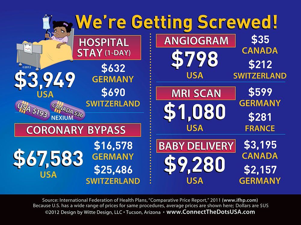 • Yet citizens in other developed countries have access to health care, even if they’re poor. In our system, if you can’t afford health insurance you’re screwed. Americans who can’t afford health insurance may be free, but they just might be dead. We’re the richest country in the world (although the money is mostly at the top), surely we can relieve that burden from our less fortunate citizens?  Obviously, you don’t agree because, if I may say so, you believe ideology trumps human needs. That’s why we see it differently.