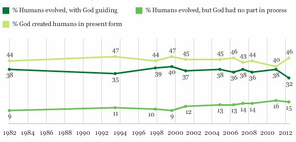 32% of Americans believe:  Human beings have developed over millions of years from less advanced forms of life, but God guided this process—–