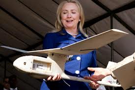 Hillary Clinton holds a small U.S.-made drone that the Ugandan military uses in Somalia to fight al-Qaeda linked militants.(Credit: Reuters)