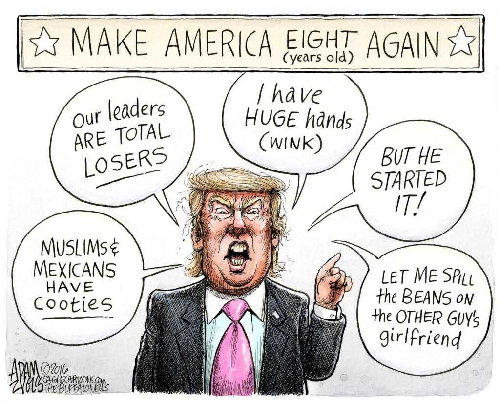 And then there’s Donald Trump, who, despite being the only candidate who has officially announced his bid, is . . . well, ranting like a deranged hobo in a dilapidated public park. No, don’t look at him — he might come over here with his sign.