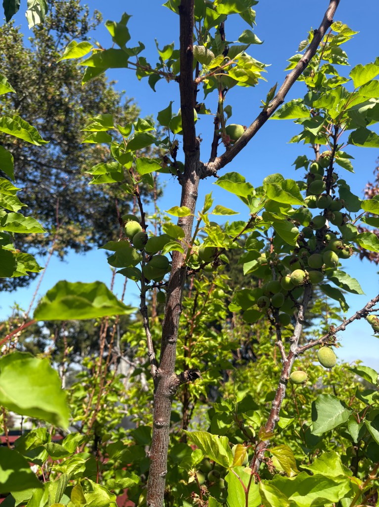 This is a photo of our reliable apricot tree, sprouting fruit earlier than usual–March! We’ve had a lot of sun and warm weather the last couple of months here in Monterey, CA and we can see the effect on our fruit trees this season!