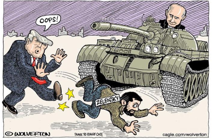 And he’s already lost World War Three – and evidently so have the British. Back home, Prime Minister Starmer did the unthinkable, met Zelensky not at the front door of Number 10 but he went INTO Downing Street to embrace him on the sidewalk. The front page of yesterday’s far right tabloid the Daily Mail headlined “outrage over U-S President’s humiliation of Zelensky” and insisted “Now stop the state visit for Bully Trump.” Demanded the British WITHDRAW their invitation for Trump to go there. But within hours their ambassador here undid all of that. Lord Peter Mandelson went on ABC This Week here and called for a “very radical re-set” that “has to consist of the United States and Ukraine getting back on the same page and President Zelensky giving his unequivocal backing to the initiative that Trump is taking to end the war and to bring a just and lasting peace to Ukraine.” Europe’s nations “need to back the calls for a ceasefire and by the way I think that Ukraine should be the first to commit to a ceasefire and defy the Russians to follow.”